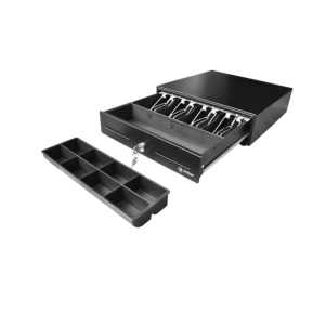 Este modelo cuenta con 4 compartimientos para billetes y 8 para monedas, diseñados para una organización rápida y eficiente del efectivo. La conexión RJ11 permite integrar el cajón fácilmente a impresoras de recibos o sistemas POS, habilitando la apertura automática sincronizada con la venta.